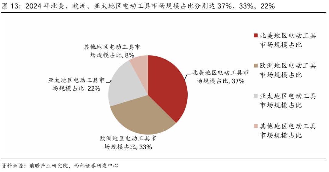 从全球市场来看,电动工具在欧美地区发展应用比较早,市场成熟度高。目前欧美市场家庭应用的电动工具需求较为普遍,形成了特有的庭院经济市场,庭院经济市场是未来锂电电动工具发展的重要市场。另外,一带一路国家包括东南亚等国家对专业级、装修级电动工具的需求也在增长,市场也在逐步释放。2024年,北美、欧洲、亚太地区电动工具市场规模占比分别达37%、33%、22%。