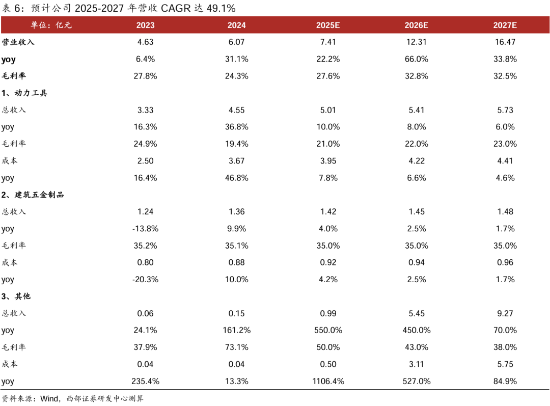 1.动力工具业务:公司营销网络发达、技术领先、拥有全供应链自制供应能力,随着动力工具市场稳健增长,预计2025-2027年公司动力工具收入分别提升10.0%、8.0%、6.0%;随着公司逐渐整合腾亚铁锚公司业务,提升公司产能利用率,预计毛利率逐年提升,2025-2027年毛利率分别为21%、22%、23%。