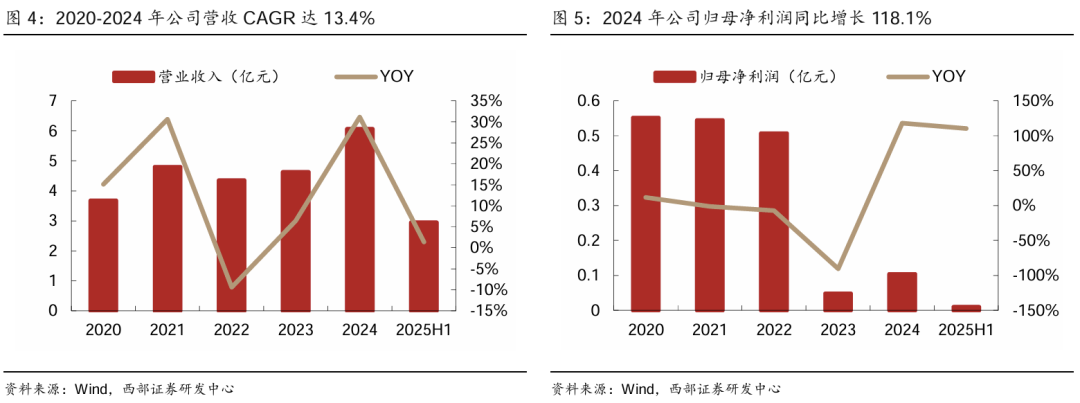 营收稳步增长,利润快速回升。2024年,公司实现营业收入6.1亿元,同比增长31.1%,2020-2024年CAGR达13.4%;实现归母净利润0.10亿元,同比增长118.1%,2020-2024年CAGR为-34.1%。2025H1公司实现营业收入2.95亿元,同比增长1.4%;实现归母净利润0.01亿元,同比增长110.3%。2023年,公司归母净利润下滑,有以下原因:1)公司产品品类不断拓张,随着募资项目陆续投入使用,多厂区经营,期间费用同比增长;2)公司针对澳洲诉讼事项计提了预计负债;3)公司收购江苏腾亚铁锚工具有限公司,其产能未完全释放处于亏损状态,固定成本及经营费用较高。