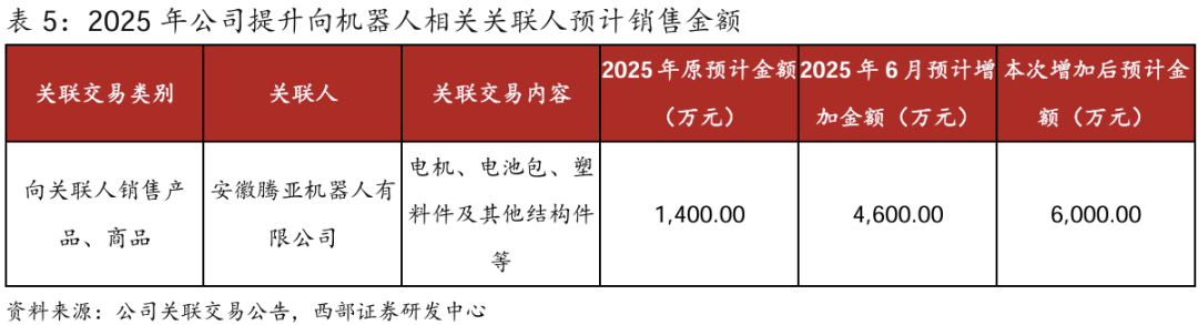 机器人相关业务快速放量,业务拐点已至。2025年1-5月公司向机器人相关关联人销售商品金额达1108万元,相较2024年全年向机器人所有相关关联人销售商品金额高914%。2025年6月,公司公告将向安徽腾亚机器人有限公司销售商品预计金额由1400万元增加至6000万元,彰显机器人相关业务业绩快速增长势头。