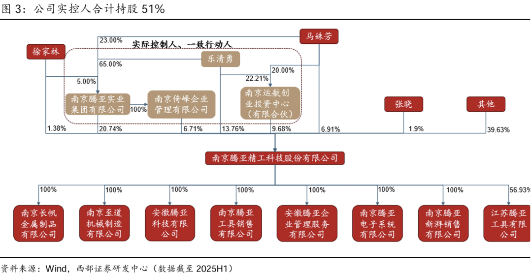 公司股权较为集中,实控人及一致行动人合计持股51%。截至2025H1,公司实际控制人及一致行动人为乐清勇先生、南京腾亚实业集团有限公司、南京运航创业投资中心(有限合伙)、南京倚峰企业管理有限公司,合计持股50.89%。