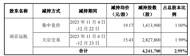 具体来看,2025年11月4日至12月23日,南京运航通过集中竞价交易和大宗交易方式合计减持公司股份4,241,700股。按照减持期间均价计算,南京运航套现约7073.74万元。