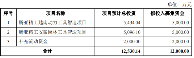 腾亚精工首次公开发行股票募集资金总额为40,706.90万元,扣除发行费用后,募集资金净额为34,134.98万元。腾亚精工于2022年5月31日披露的招股说明书显示,该公司拟募集资金37,524.97万元,分别用于“气动工具厂区建设项目”“高品质五金件、气动工具耗材及配件制造基地项目”“研发中心及信息化建设项目”。