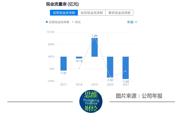 2017年至2021年,达嘉维康的经营现金流净额分别为-1.01亿元、-0.13亿元、1.36亿元、-1.51亿元和-1.62亿元。达嘉维康曾在招股书中表示,经营现金流吃紧的主要原因是应收账款增加、应付账款减少和存货的增加。
