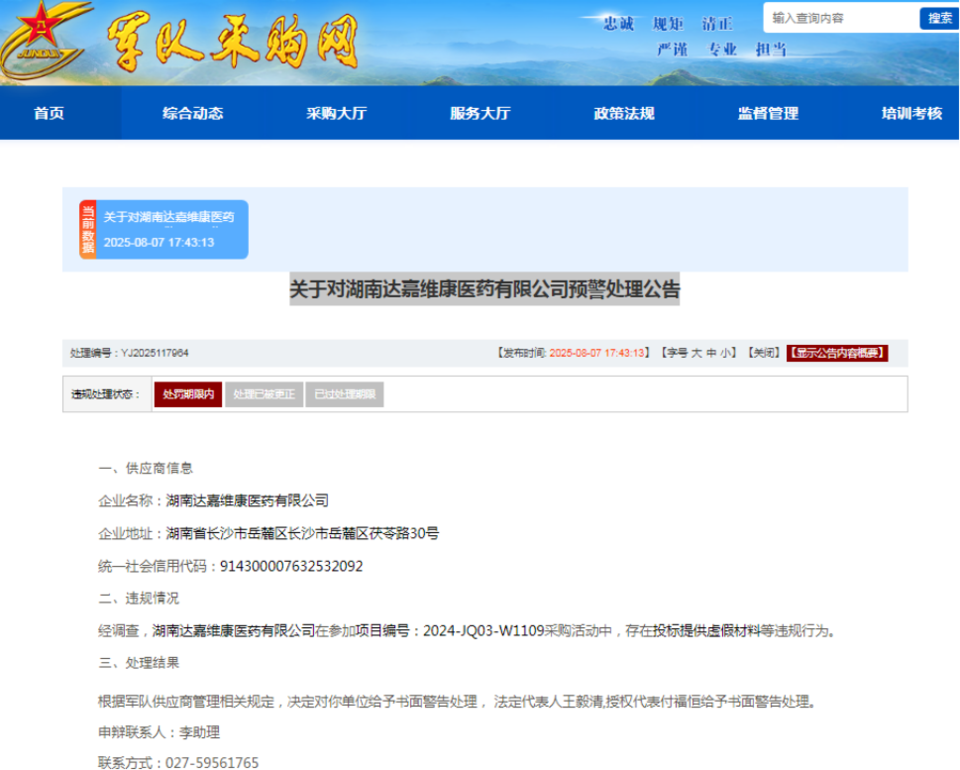 根据军队供应商管理相关规定,决定对湖南达嘉维康医药有限公司给予书面警告处理,法定代表人王毅清、授权代表付福恒给予书面警告处理。
