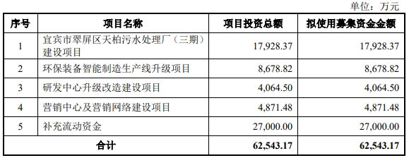 此前披露的招股书显示,天源环保原拟募资6.25亿元,拟分别用于“宜宾市翠屏区天柏污水处理厂(三期)建设项目”、“环保装备智能制造生产线升级项目”、“研发中心升级改造建设项目”、“营销中心及营销网络建设项目”、“补充流动资金”。