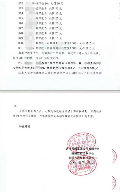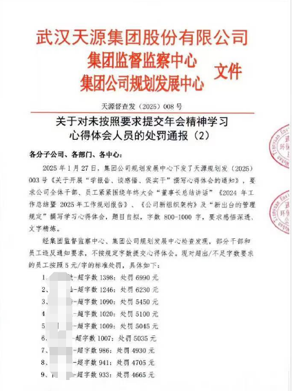 近日,网上流传着一份《关于对未按照要求提交年会精神学习心得体会人员的处罚通报(2)》的文件,该文件中提及,2025年1月27日,集团公司规划发展中心下发了天源规划发(2025)003号《关于开展“学报告、谈感悟、促实干”撰写心得体会的通知》,要求公司全体干部、员工紧紧围绕年终大会“董事长总结讲话”《2024年工作总结暨2025年工作规划报告》、《公司新组织架构》及“新出台的管理规定”撰写学习心得体会,题目自拟,字数800-1000字,要求感深透、文字精炼。