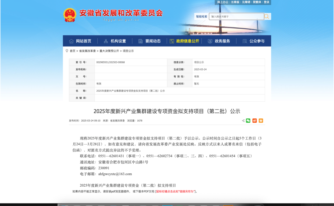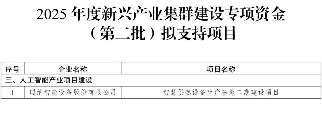 近日,安徽省发展和改革委员会公示了2025年度新兴产业集群建设专项资金拟支持项目(第二批)名单,瑞纳智能设备股份有限公司“智慧供热设备生产基地二期建设项目”成为“人工智能产业项目建设”的唯一入选项目,获得专项资金支持2000万元,其中省级资金1000万元,市级配套资金500万元,县级配套资金500万元。