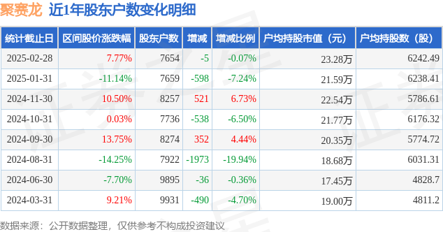 近日聚赛龙披露,截至2025年2月28日公司股东户数为7654.0户,较1月31日减少5.0户,减幅为0.07%。户均持股数量由上期的6238.0股增加至6242.0股,户均持股市值为23.28万元。