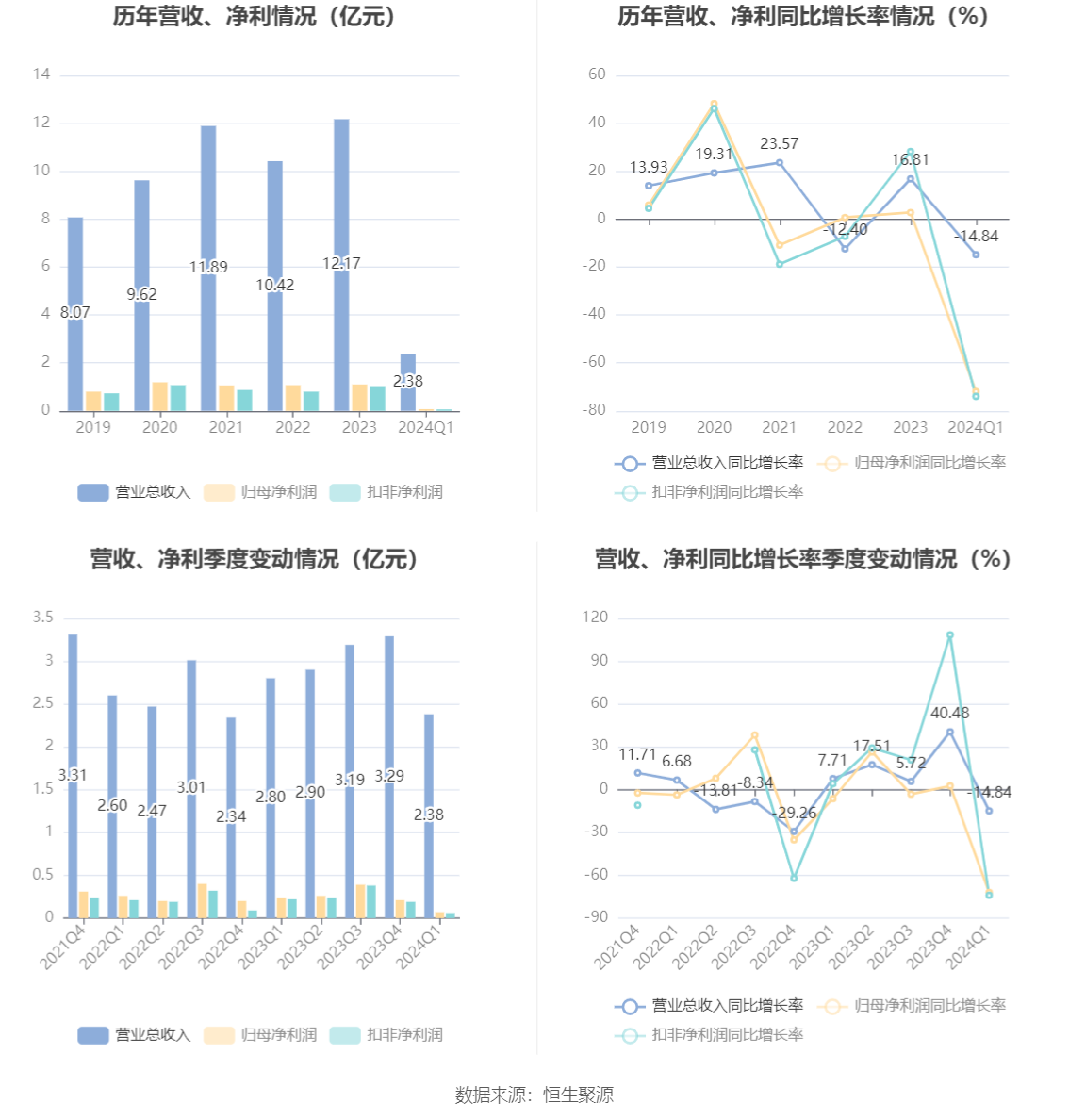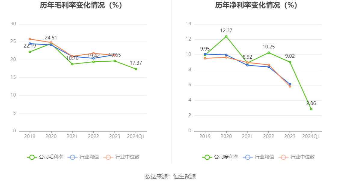 2024年第一季度,公司毛利率为17.37%,同比下降2.52个百分点;净利率为2.86%,较上年同期下降5.83个百分点。