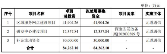 元道通信本次发行募集资金总额116,918.40万元,募集资金净额为106,518.26万元。公司最终募集资金净额比原计划多22256.16万元。元道通信于7月4日发布的招股书显示,拟募集资金84,262.10万元,分别用于区域服务网点建设项目、研发中心建设项目、补充流动资金。