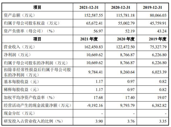 2019年、2020年、2021年,元道通信营业收入分别为75,327.79万元、122,472.50万元、162,450.83万元;净利润分别为6,226.80万元、8,766.87万元、10,669.62万元;归属于母公司股东的净利润分别为6,226.80万元、8,766.87万元、10,669.62万元;扣除非经常性损益后归属于母公司股东的净利润分别为6,023.39万元、8,260.64万元、9,784.41万元;经营活动产生的现金流量净额分别为6,382.82万元、9,793.79万元、-9,192.16万元。