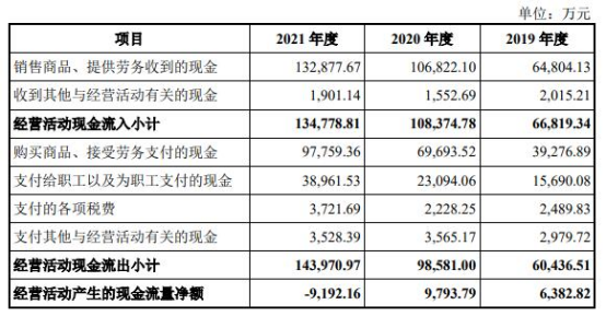 2019年、2020年、2021年,元道通信主营业务收入分别为75,327.79万元、122,472.50万元、162,450.83万元;销售商品、提供劳务收到的现金分别为64,804.13万元、106,822.10万元、132,877.67万元;主营业务收现比分别为0.86、0.87、0.82。