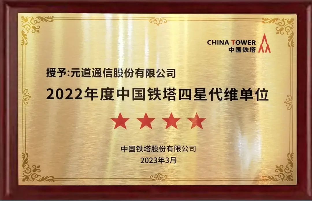 近日,中国铁塔2023年度代维工作会议暨安全生产工作会议在北京召开。会上,中国铁塔对2022年度星级代维单位进行授牌,元道通信荣获“中国铁塔四星代维单位”荣誉。本次能够获奖表明中国铁塔对元道通信运维服务质量的高度认可,充分彰显了公司的综合实力。