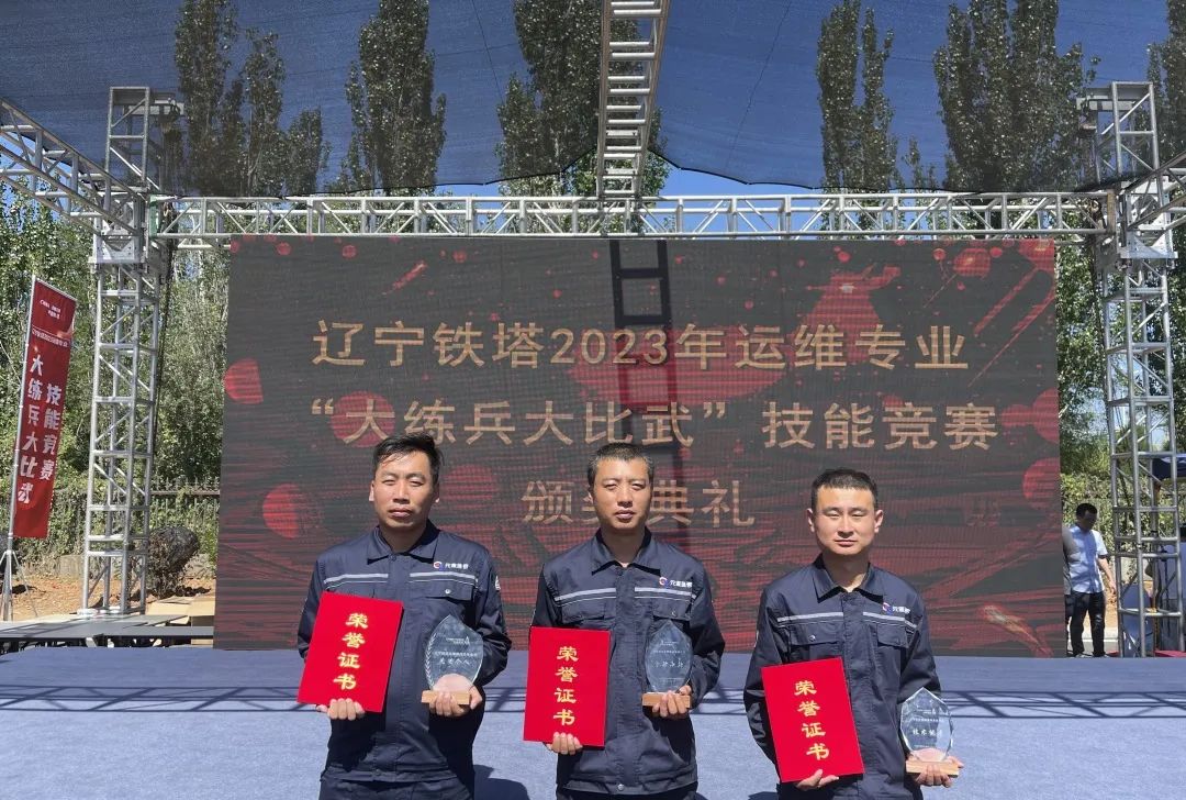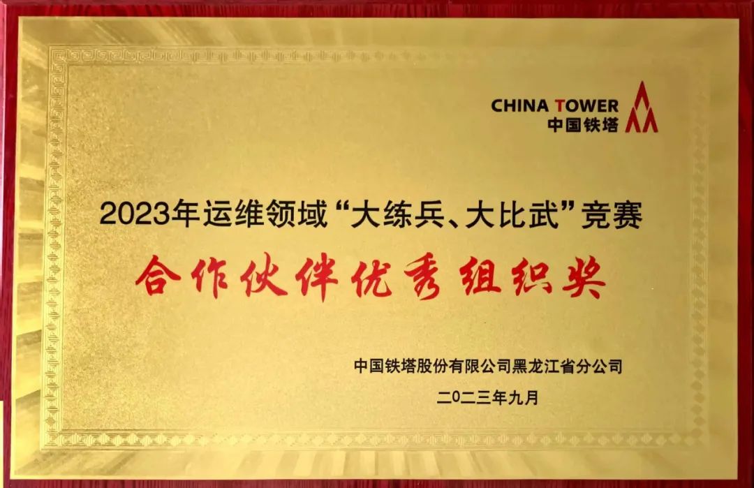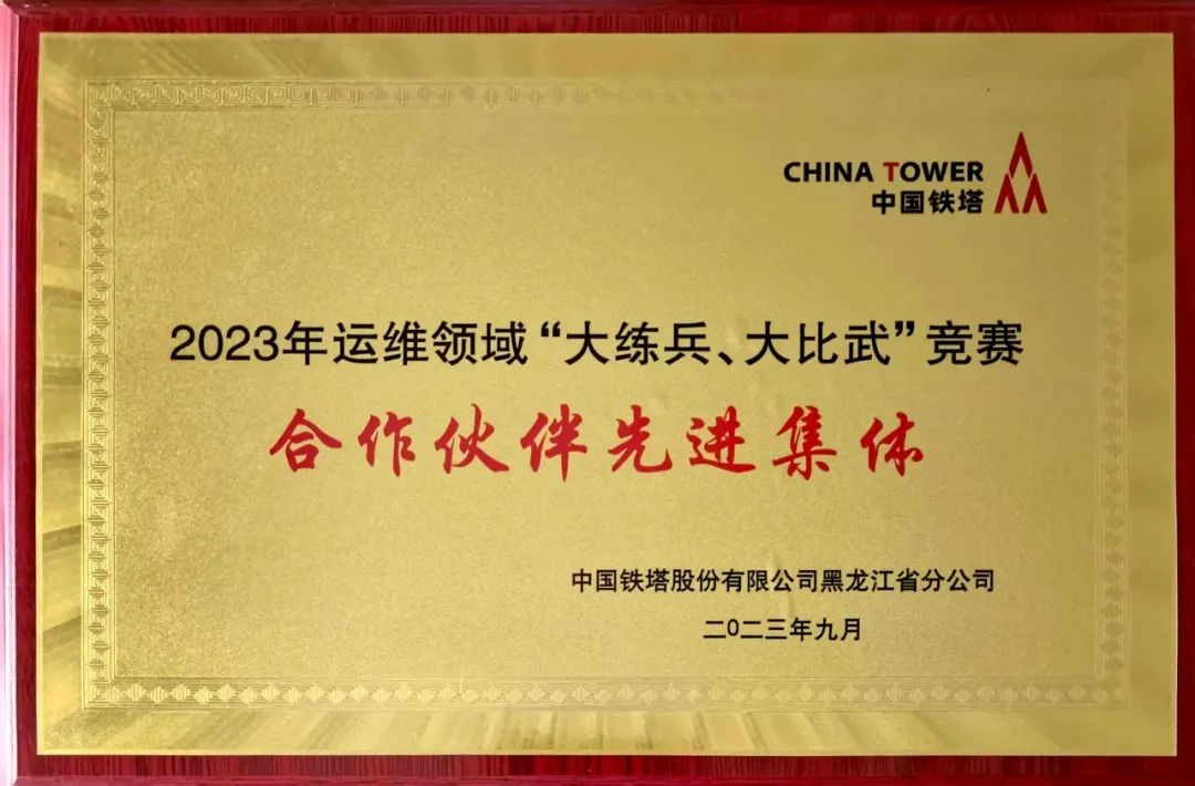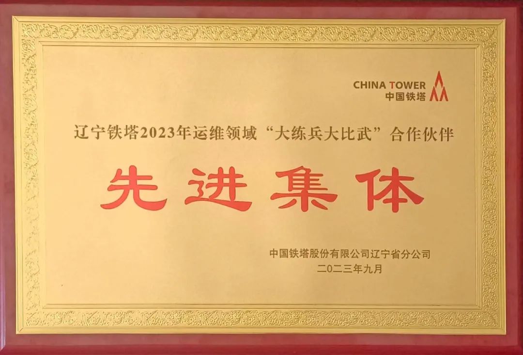 在辽宁铁塔大比武竞赛中,公司15人组成的参赛队伍从223人中脱颖而出,以总成绩第一名获得“辽宁铁塔2023年运维领域大练兵大比武合作伙伴先进集体奖”。公司员工单国良、孙茂获动环专业个人赛第1名、付帆获配套专业第2名,被授予“辽宁铁塔运维领域合作单位技术能手”荣誉称号;迟立威获动环专业、配套专业第5名,被授予“辽宁铁塔运维领域合作单位先进个人奖”荣誉称号。
