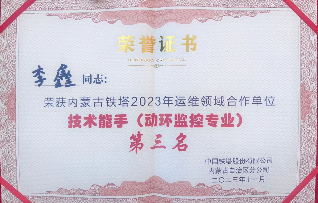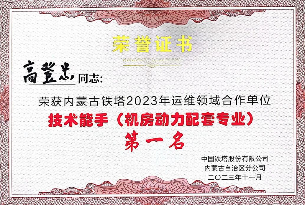 11月7日,内蒙古铁塔运维大比武落下帷幕,经过激烈的角逐、严格的评比,最终我司取得“动力配套专业”第一名,被评为“合作伙伴先进集体”,我司员工高登忠荣获“技术能手(机房动力配套专业)”第一名、李鑫荣获“技术能手(动环监控专业)”第三名。