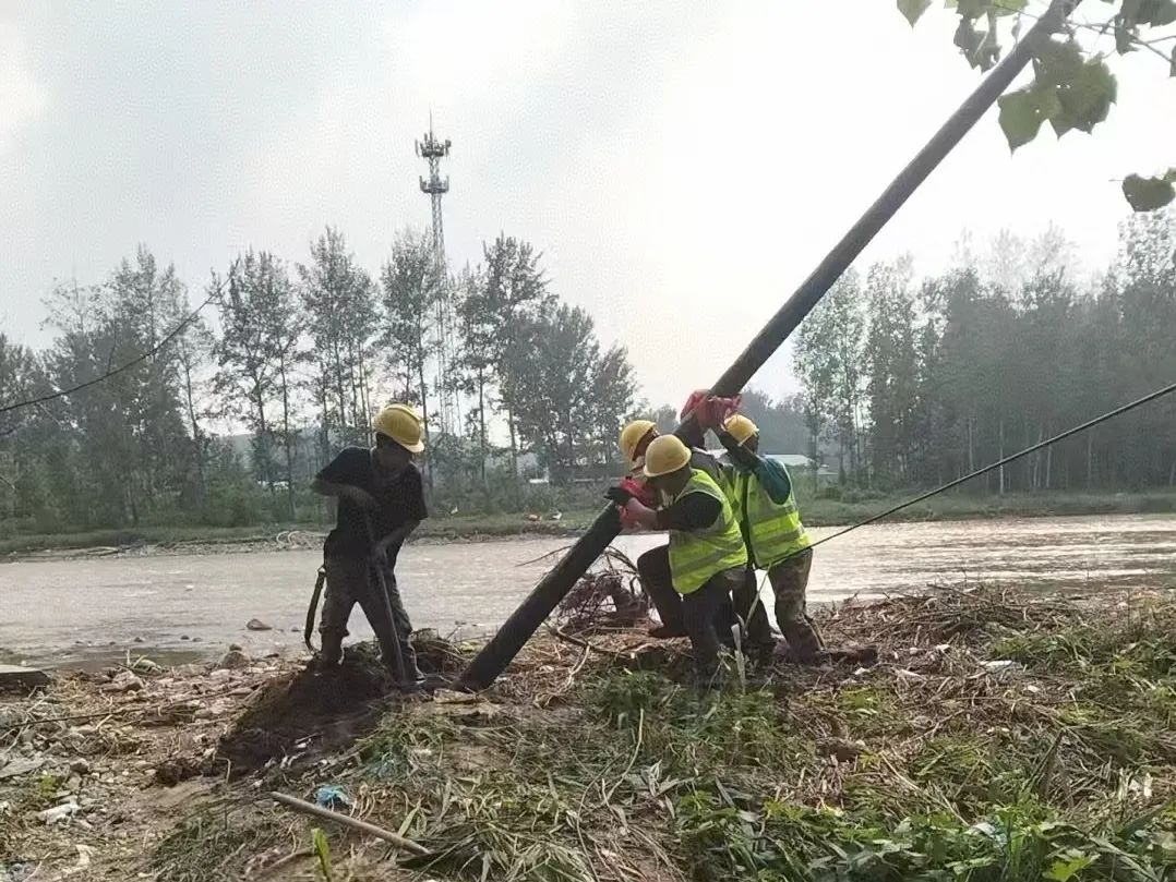 在易县永福路103号,周边河道水位持续攀升,部分区段防护堤被河水漫过,沿岸的通信杆路被冲垮,造成局部通信中断。抢修队员迅速集结,分工协作,合力扶正杆路、熔接光缆并重新架设,为区域通信恢复奠定基础。