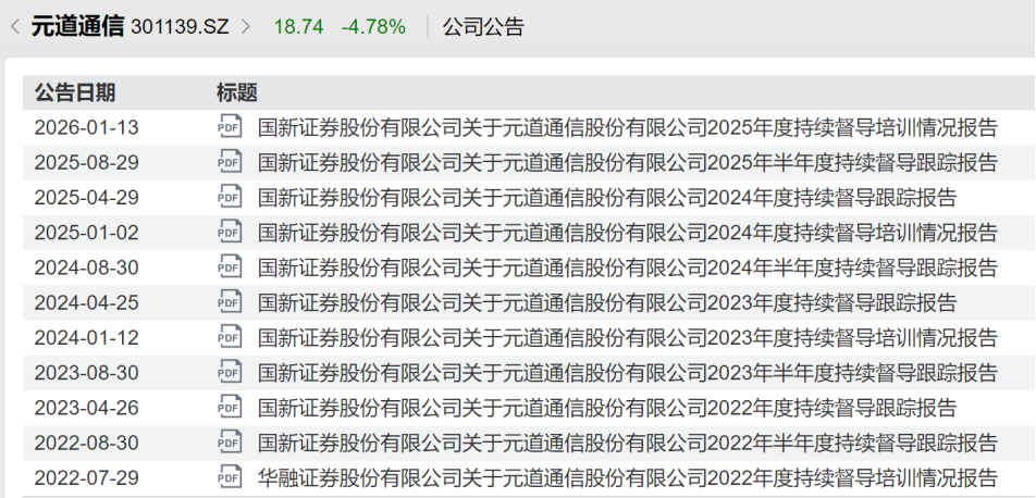 元道通信成立于2008年9月,是一家全国性、综合型的通信技术服务提供商,主业聚焦通信网络维护与优化、通信网络建设等通信技术服务和ICT服务,2022年7月在深交所创业板上市,IPO保荐机构和持续督导机构为国新证券(原华融证券),保荐代表人为潘建忠、乔军文。