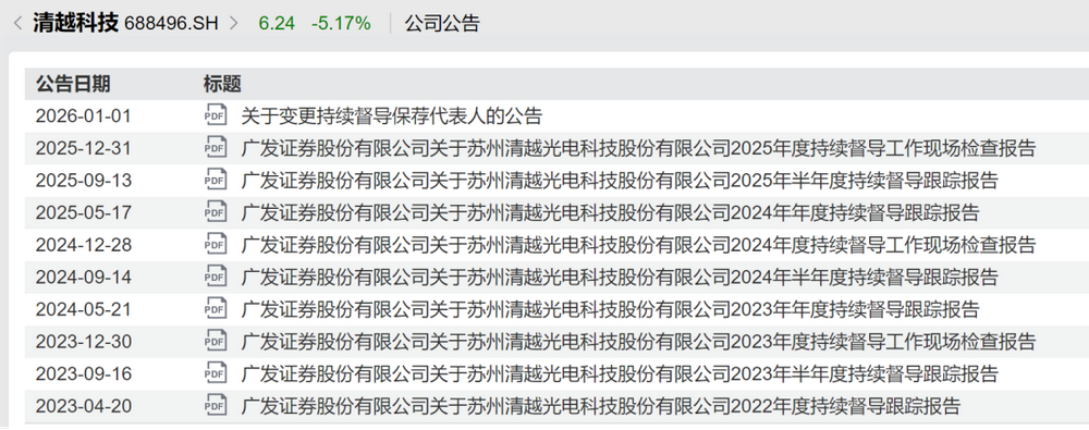 清越科技成立于2010年,是一家致力于物联网终端显示整体解决方案的供应商,于2022年12月在上交所科创板上市,上市发行审计机构为立信会计师事务所(特殊普通合伙);上市保荐和持续督导券商均为广发证券,保荐代表人为刘世杰和赵瑞梅。2025年底,清越科技发布公告,赵瑞梅因退休不再履职,由戴宁接任,变更后督导工作由刘世杰与戴宁共同负责。