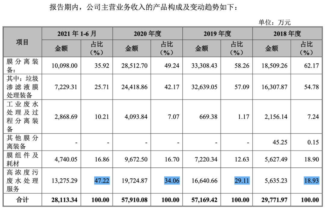 报告期内,高浓度污废水处理服务实现收入1.83亿元,营业收入同比增长38.15%;其中全量化处理实现收入6754.51万元,占高浓度污废水处理服务的36.83%。值得注意的是,高浓度污废水处理服务在3.47亿主营业务收入中的占比已经突破52.7%,去年同期这一数字是47.22%,而在2020年底、2019年底、2018年底分别是34.06%、29.11%、18.93%。