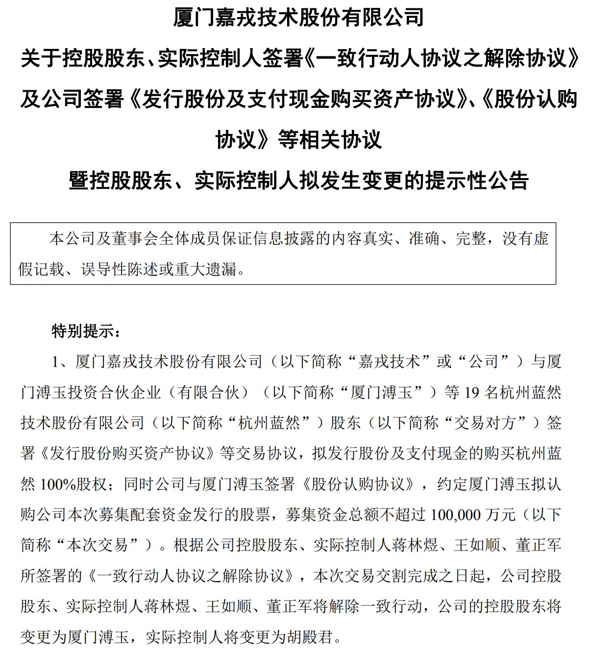 嘉戎技术 拟通过发行股份及支付现金的方式,购买 杭州蓝然技术股份有限公司 (以下简称“杭州蓝然”)100%股权,并拟向 厦门溥玉投资合伙企业 (有限合伙)(以下简称“厦门溥玉”)发行股份募集配套资金不超过10亿元。