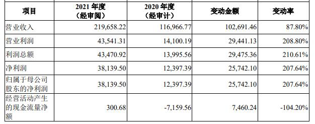 2021年度,中一科技营业收入为219,658.22万元,同比增长87.80%;净利润为38,139.50万元,同比增长207.64%;归属于母公司股东的净利润38,139.50万元,同比增长207.64%;实现扣除非经常性损益后归属于母公司股东的净利润37,513.13万元,同比增长211.86%;经营活动产生的现金流量净额300.68万元,上年同期为-7159.56万元。