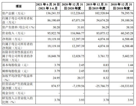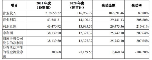 2021年度,中一科技营业收入为219,658.22万元,同比增长87.80%;净利润为38,139.50万元,同比增长207.64%;归属于母公司股东的净利润38,139.50万元,同比增长207.64%;实现扣除非经常性损益后归属于母公司股东的净利润37,513.13万元,同比增长211.86%;经营活动产生的现金流量净额300.68万元,上年同期为-7159.56万元。