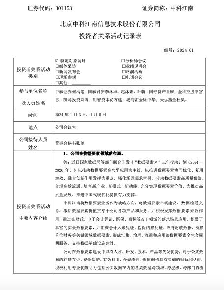 中科江南还向投资者介绍了预算单位云服务业务。预算单位云服务是公司面向预算单位客户市场提供包括会计核算云平台、内控一体化云平台、电子凭证综合服务平台等一揽子云服务解决方案。公司凭借预算管理一体化系统服务了16.2万家预算单位客户,可以为这些客户提供包括单位会计、报销、财务、核算、内控等在内的全方位财务会计服务。