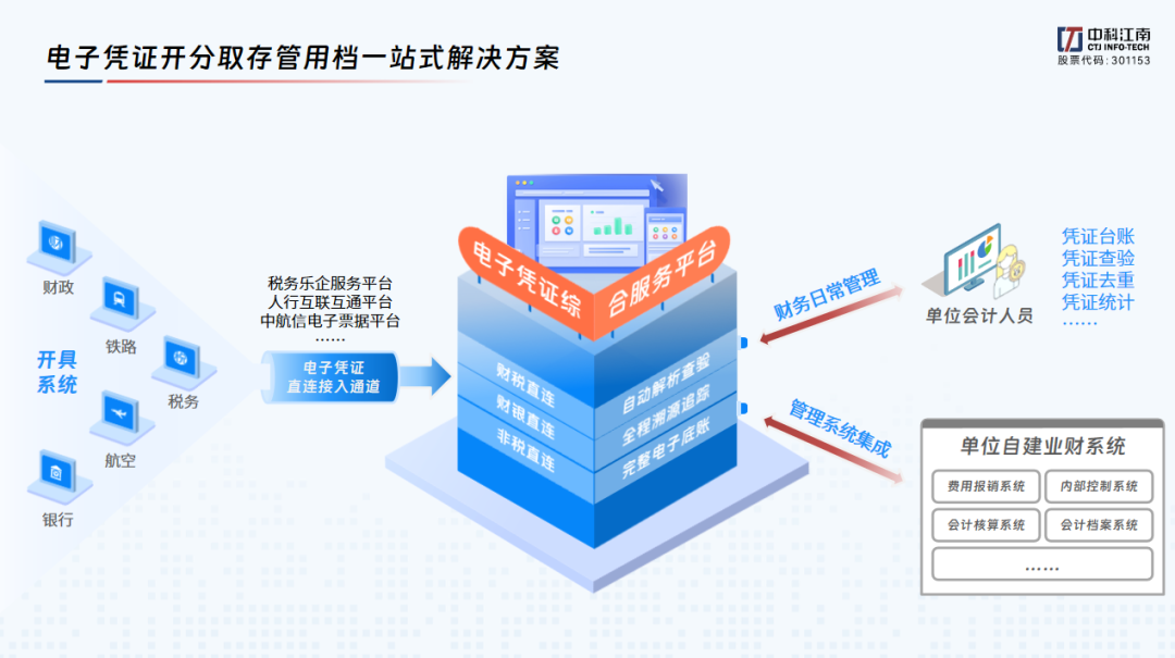 中科江南“电子凭证综合服务平台”完全遵循电子凭证会计数据标准,具备电子凭证开具、分发、获取、存储、管理、应用、归档等全流程服务能力,面向企业、金融机构、行政事业单位等各类型主体提供电子凭证按照会计数据标准实现全流程、标准化、无纸化、自动化处理解决方案,一站式、聚合式解决电子凭证接收难、解析难、验签难、报销难、入账难、归档难等问题。中科江南“电子凭证综合服务平台”可以有效帮助电子凭证接收端单位降低电子凭证会计数据标准应用的技术难度和实施成本,已经支持10多个省市政务财务服务平台以及部分行政事业单位、大型央企国企、金融机构、代理记账平台等各类型主体实现电子凭证会计数据标准应用落地。