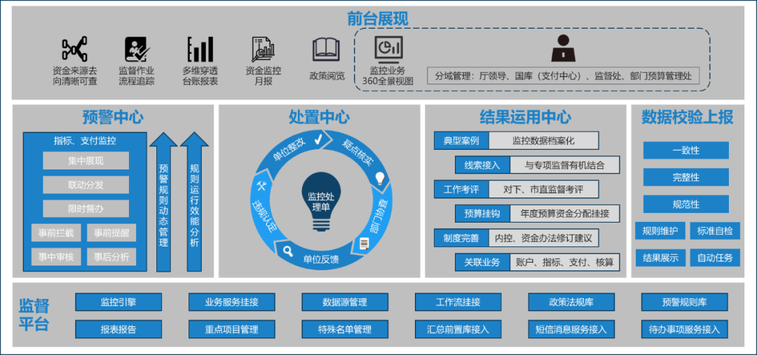 应用“集中化”:实现各类监督、监控、监测类应用系统“大集中”,有效解决分散建设造成的业务规范不统一,技术标准及数据标准不兼容等问题,构筑预算执行监督信息化一盘棋发展“新模式”。