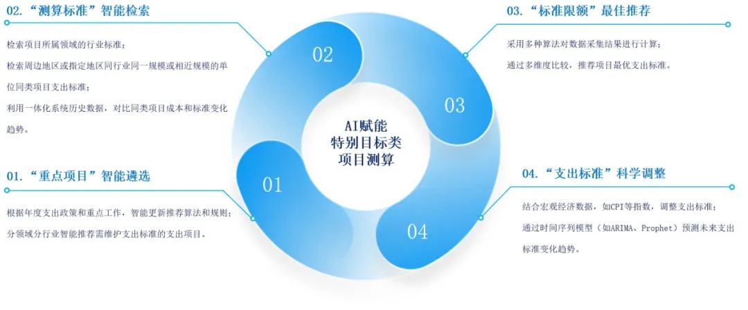 特定目标类项目的预算支出标准体系建设涵盖范围广、专业性强,目前在一体化系统中缺少动态调整机制。通过引入AI技术开展成本绩效分析和支出标准体系构建,提高预算的科学性和可执行度。
