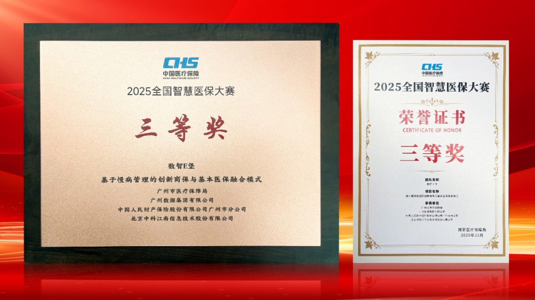 在广州市医保局指导下, 中科江南 协助广州数据集团、联合中国 人保财险 共同申报的“基于慢病管理的创新商保与基本医保融合模式”项目,凭借在数据融合、机制创新与民生保障方面的突出表现,荣获总决赛三等奖。这也是 中科江南 在医疗保障创新实践的国家级大赛中再度获得荣誉。