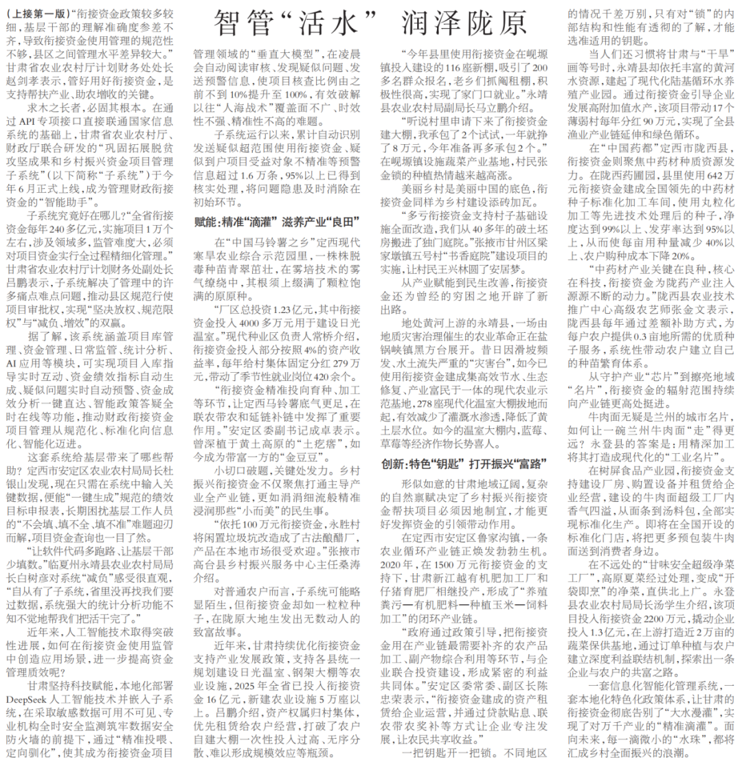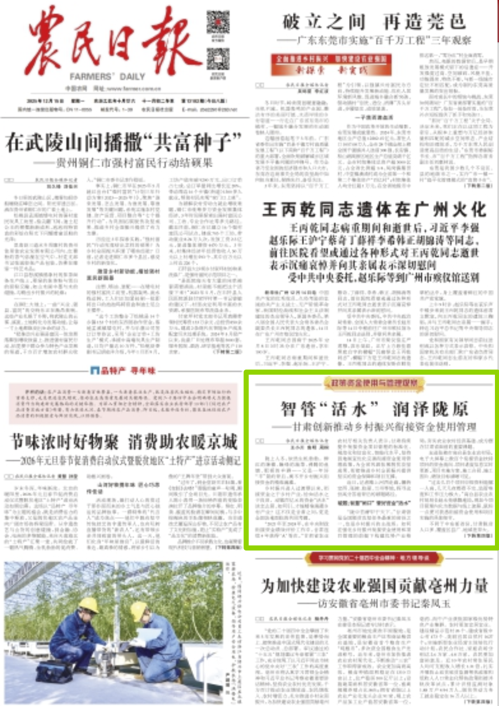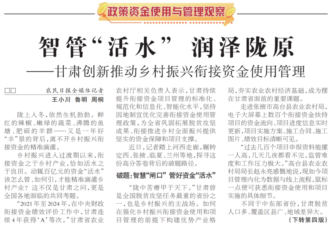 近日,农业农村部直属《农民日报》头版刊发《智管“活水”润泽陇原—甘肃创新推动乡村振兴衔接资金使用管理》一文,重点报道甘肃省“巩固拓展脱贫攻坚成果和乡村振兴资金项目管理子系统”的建设与应用成效。该系统由 甘肃省农业农村厅 、财政厅联合研发, 中科江南 作为承建方,构建管理财政衔接资金的“智能助手”,实现对项目资金全过程精细化管理。