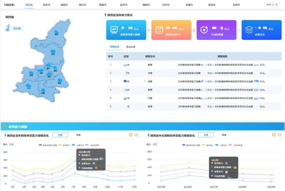 财政是国家治理的重要支柱,精准研判财力是防范化解财政运行风险的关键。通过整合省、市、县各级财政预算、收支、债务等全口径数据,构建科学、客观、标准的评估体系,实现在重大政策出台或重点项目落地前,对当年及中长期财政可承受能力的自动测算、评估分析、动态更新与风险预警,并动态可视化呈现财力规模。既保障重点任务支出“不缺位”,又防范财政运行风险“不越线”,真正落实“把钱花在刀刃上”。