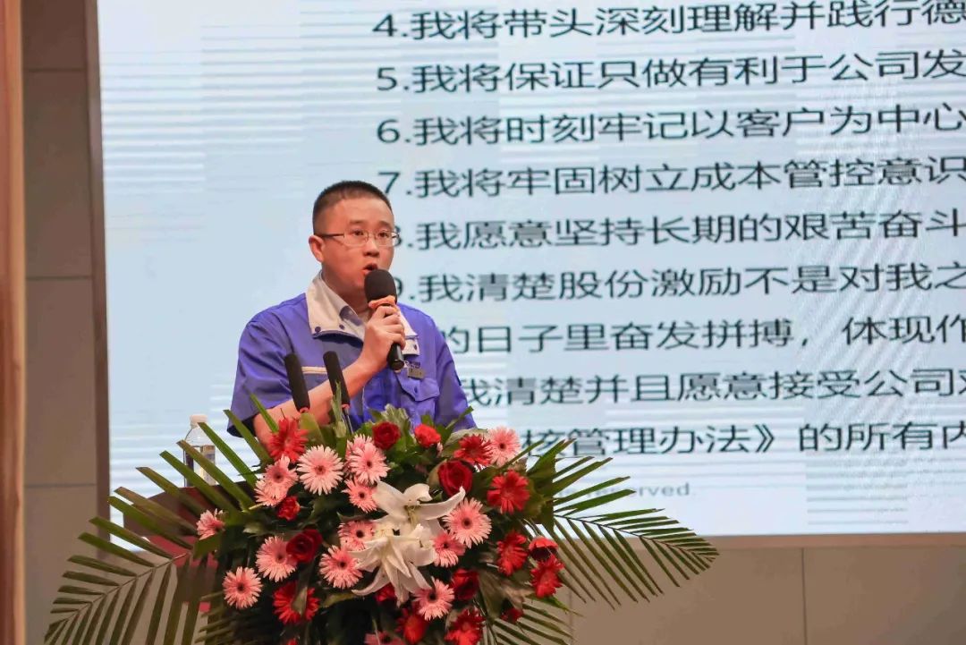随后,公司持股人代表王峰先生登台,代表全体持股人庄严宣誓。誓言虽短,但字字千钧。持股明志,这份誓言承载着与公司“同呼吸、共进退”的坚定承诺,扛起了岗位、团队与发展的责任担当,与公司同心同德,共担重任。