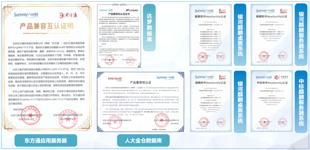 为积极响应国产化和信创战略号召,三维天地对SW-LIMS V14进行了适配,包括服务器、操作系统、中间件和数据库等方面的国产化。同时,研发团队还与部分产品进行了兼容互认证明,以更好地满足客户需求。