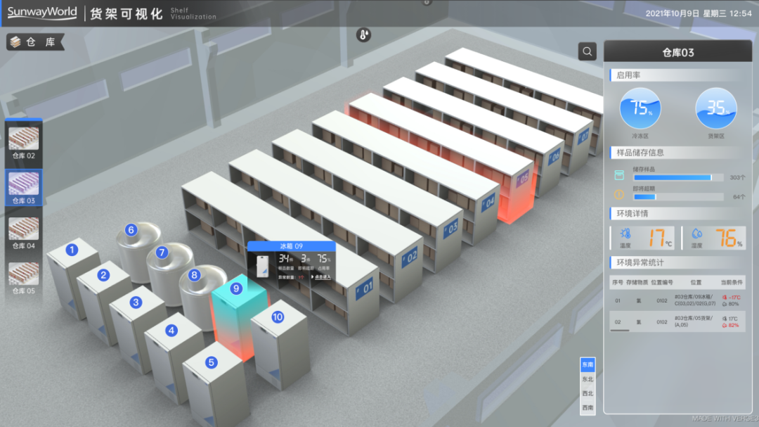 SW-LIMS V14利用3D和数字孪生技术,构建了可视化应用,包括可视化生物样本库管理、3D仓库可视化管理、智慧楼宇等应用。其中,3D仓库可视化管理能够实时监控仓库的温度、湿度等环境情况,并对库存使用率、样品存储状态进行实时统计和监控预警,为用户提供更加便捷、高效的管理体验。