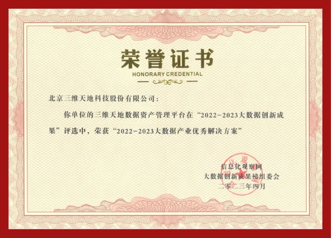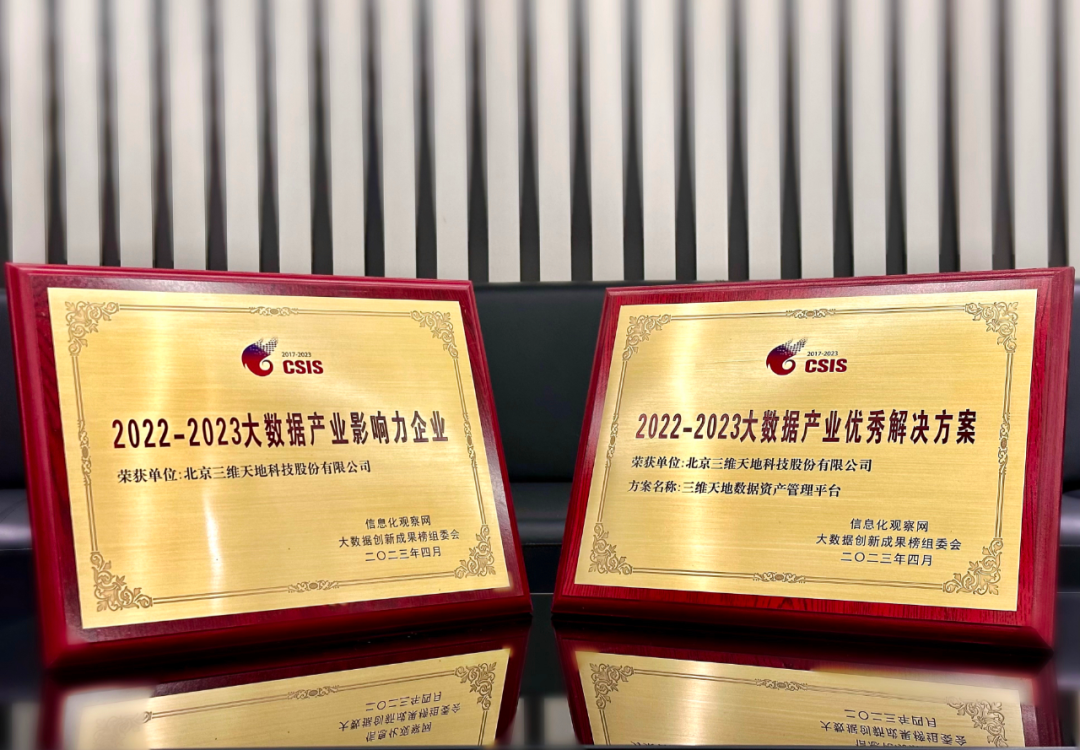 近日,由中国信息协会大数据分会主办,信息化观察网承办的《2022-2023大数据创新成果征集》公布了各奖项评选结果。三维天地凭借在大数据产品与应用创新领域的综合优势,荣获2022-2023大数据产业影响力企业。同时,三维天地数据资产管理平台V12斩获2022-2023大数据产业优秀解决方案。