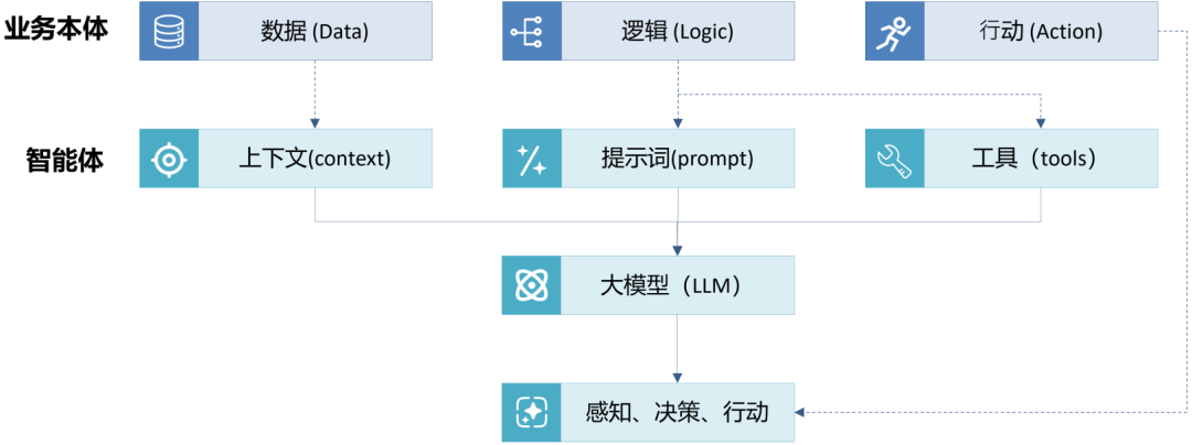 业务本体围绕数据、逻辑和行动三个核心要素进行构建: