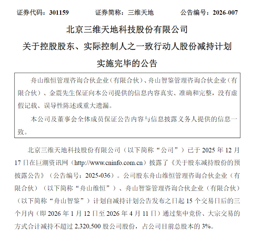 2月24日,三维天地发布公告披露了关于控股股东、实际控制人之一致行动人股份减持计划实施完毕的公告。公司已于2025年12月17日披露了《关于股东减持股份的预披露公告》。公司股东舟山维恒管理咨询合伙企业(有限合伙)(以下简称舟山维恒)、舟山智鉴管理咨询合伙企业(有限合伙)(以下简称舟山智鉴)计划自减持计划公告发布之日起15个交易日后的三个月内(即2026年1月12日至2026年4月11日)通过集中竞价、大宗交易的方式合计减持不超过2,320,500股公司股份,占公司目前总股本的3%。