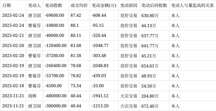 深交所公开信息显示,2月24日,翔楼新材董事、高管唐卫国在竞价交易公司股票,减持股数6.96万股,成交均价87.42元,变动金额608.44万元,变动后持股数为630.80万股。