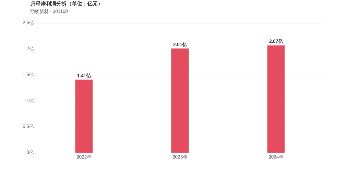 利润角度分析,2022年翔楼新材实现归母净利润1.41亿元,2024年2.07亿元。归母净利润增速波动较大,2023年达到42.2%的高增长后,2024年回落至3.1%。