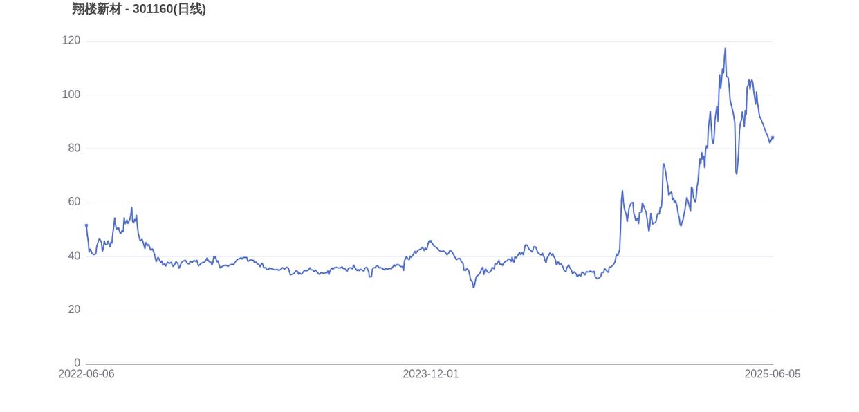 2025年3月20日,翔楼新材的市值巅峰达到97.18亿元,股价也顺应升至119.9元。而至6月5日收盘,翔楼新材的股价为84.16元,市值为68.21亿元,相比峰值时期市值减少28.97亿元,市值蒸发了29.81%。
