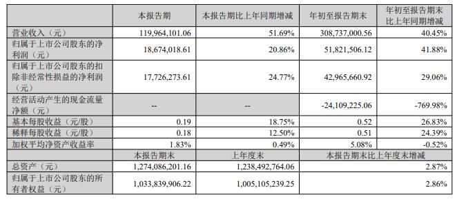 国能日新2023年三季度报告显示,2023年第三季度,国能日新实现营业收入1.20亿元,同比增长51.69%;归属于上市公司股东的净利润1867.40万元,同比增长20.86%;归属于上市公司股东的扣除非经常性损益的净利润1772.63万元,同比增长24.77%。