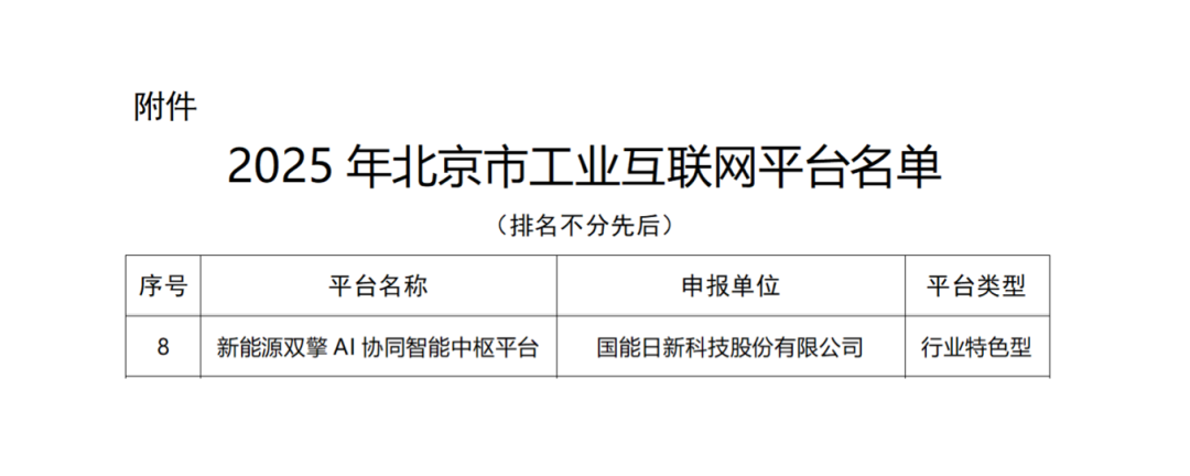 近日,北京市经济和信息化局正式公布2025年北京市工业互联网平台名单, 国能日新 自主研发的“新能源双擎AI协同智能中枢平台”成功入选“行业特色型”工业互联网平台,获市级权威认可!此次入选的平台名单覆盖了重点行业的核心赛道,竞争尤为激烈。