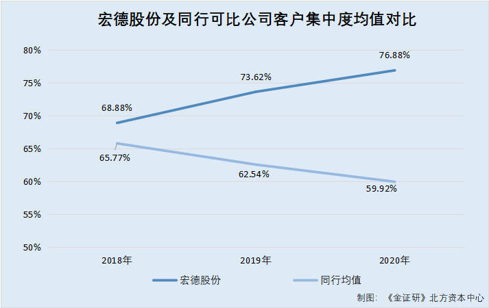 根据《金证研》北方资本中心研究,2018-2020年,宏德股份除了永冠集团外的同行业可比公司前五大客户销售收入占营业收入比例的均值分别为65.77%、62.54%、59.92%。