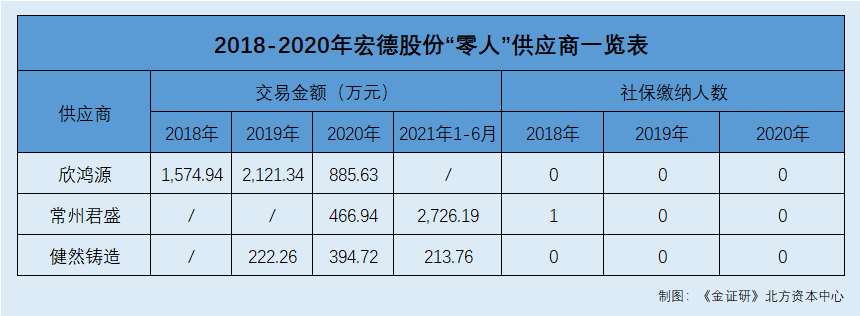 换言之,欣鸿源或不存在由其实际控制人吴际武控制的其他企业为其代缴社保的情况。2020年及2021年1-6月,欣鸿源为宏德股份交易额上千万元的供应商。然而,2018-2020年,欣鸿源社保缴纳人数均为零人。
