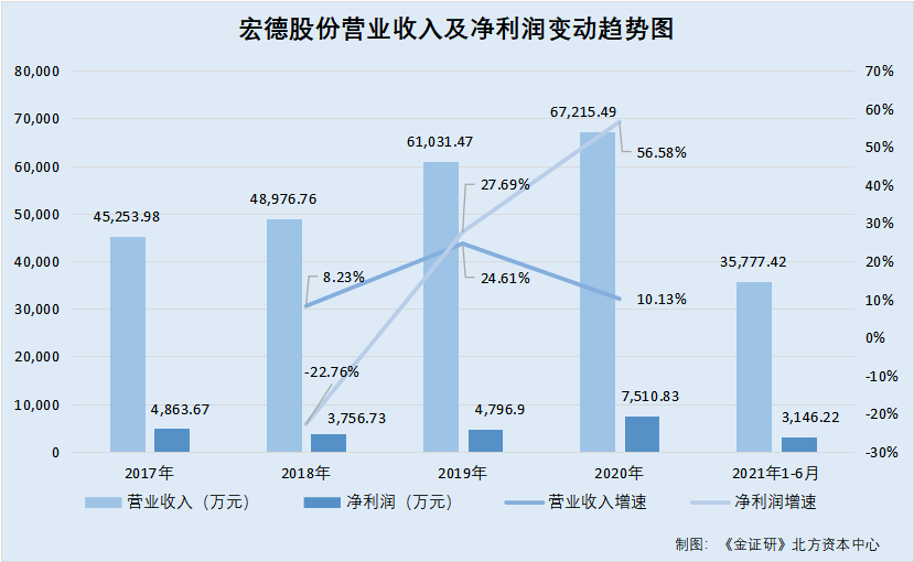 根据《金证研》北方资本中心研究,2018-2020年,宏德股份营业收入分别同比增长为8.23%、24.61%、10.13%,净利润分别同比增长为-22.76%、27.69%、56.58%。