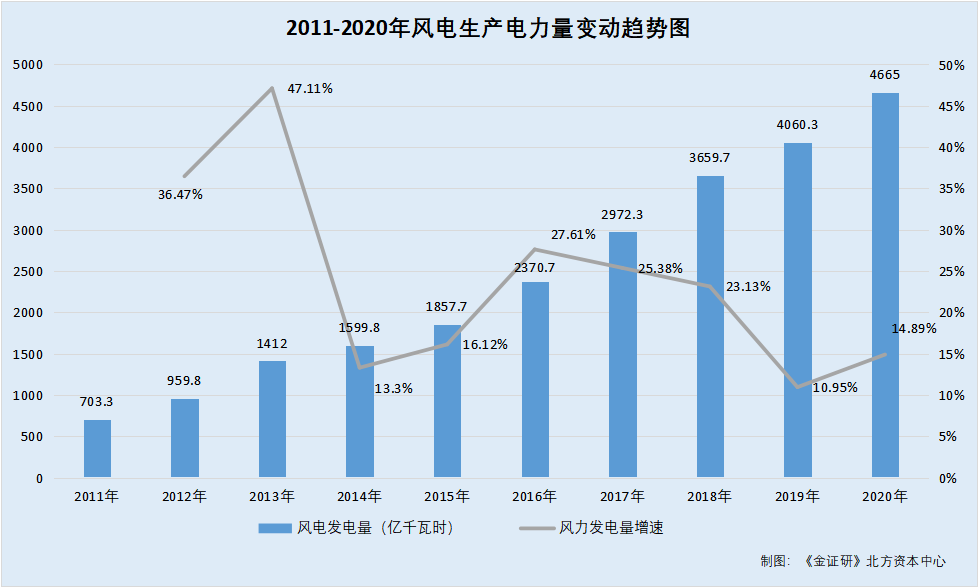 根据《金证研》北方资本中心测算,2012-2020年,国内风电生产电力量增速分别为36.47%、47.11%、13.3%、16.12%、27.61%、25.38%、23.13%、10.95%、14.89%。