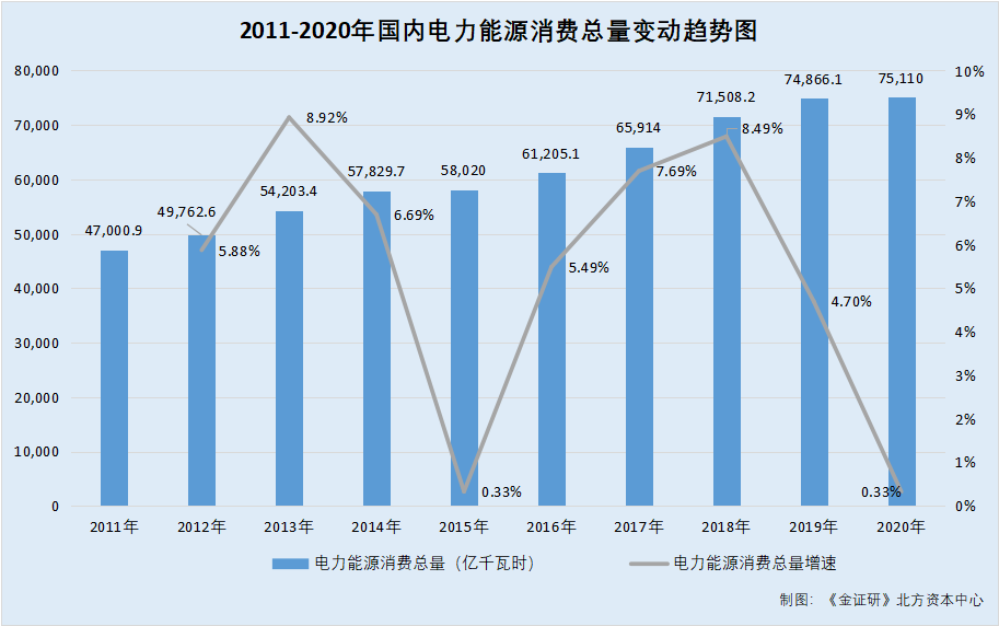 根据《金证研》北方资本中心测算,2012-2020年,国内电力能源消费总量增速分别为5.88%、8.92%、6.69%、0.33%、5.49%、7.69%、8.49%、4.7%、0.33%。
